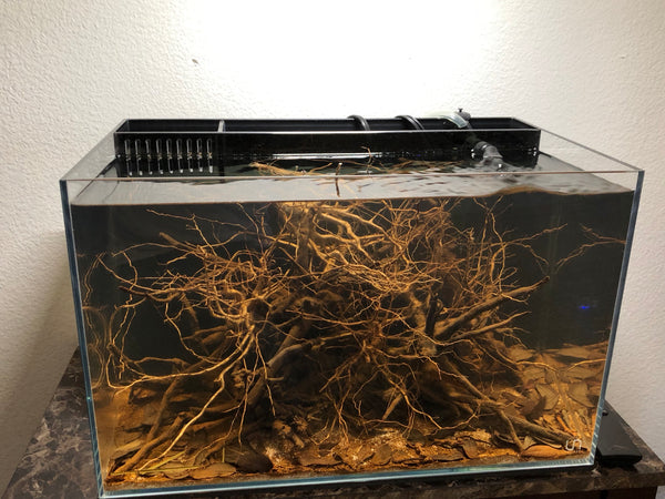 By setting up your substrate, and regularly wetting these materials- the substrate, leaves, botanicals, and wood- down for a few days, and letting them saturate, it’s entirely possible to go from “terrestrial” to “aquatic” in a very short period of time, and getting the cool effect- and indeed, part the function (a burst of microbial life, biofilms, fungal growths, and release of tannin and humic substances) of this system from the start.