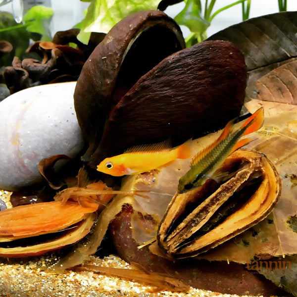 Or, you can simply allow much of the material to remain in play, and add new pieces as you see fit. A sort of actively-managed “evolutionary” process. One that not only mimics Nature in many respects (I mean, leaves and seed pods and stuff are constantly falling into, or being swept by currents into, aquatic habitats, right?), it will keep the microorganism/fungal/microcrustacean population aquarium biologically “fueled up”, with a continuous supply of new food sources…just like in Nature!