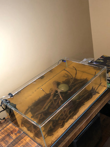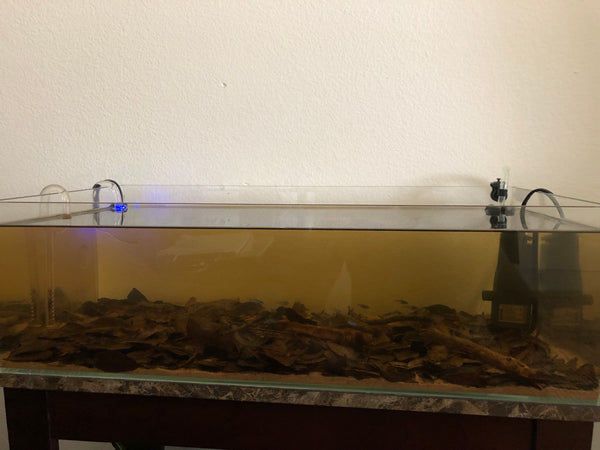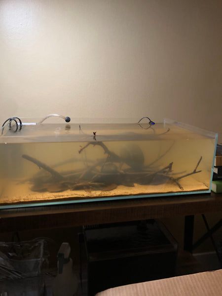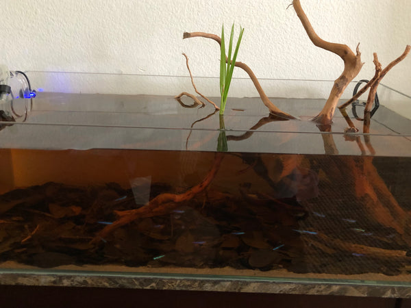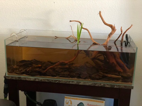 So what I had was the tank I had yearned for all these years: Shallow, tinted water, a very thin layer of sand, and a cover of leaves and just a few small oak twigs.