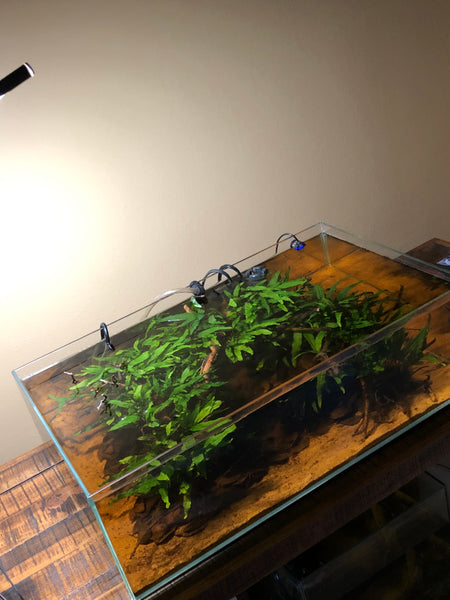 Taking this aquarium from a “hardscape” ( to steal an aquascaping term) to a “quasi-biotopic” planted aquarium was a fun! I envisioned a section of a Southeast Asian stream, where the epiphytic Microsorum is growing on some submerged twigs and branches near the shoreline.